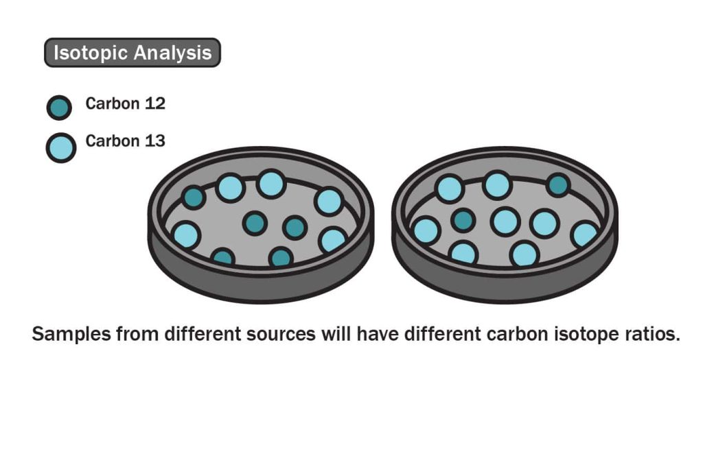 Una forma especial de espectrometría de masas permite determinar qué isótopos están presentes y en qué cantidades en un aceite esencial. Para los aceites esenciales de la misma ubicación, las proporciones de isótopos deben ser consistentes para cada componente. Si un componente específico muestra un perfil isotópico diferente, esto indica al analista de control de calidad que el aceite ha sido alterado.
